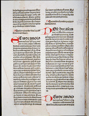 Following the standard bibliographic data for each item in this and the next section (Printed Books, 1851-1914), the Gimbel collection call number is identified. Additionally, where appropriate, references are given to corresponding entries in such standard bibliographies as Hain, Brockett, Gamble, and Randers-Pehrson (the last coded R-P) listed in the “Printed Books, 1489-1850” section of the Bibliography of this program. For books published before 1701, numbers are given for the Pollard or Wing short-title catalogues coded STC and also listed in the Bibliography.  If an entry in the Bibliography refers not to the holding in the Gimbel collection but to a closely related book or edition, the number is placed in brackets. Finally, and again where appropriate, other copies and editions in the Gimbel collection of the item described are noted. Thus for Historia Alexandri, the first item described in this section, the Gimbel call number is AC10.A4 1489, and “Hain 780” refers to the number of the relevant entry in Ludwig Hain, Reportorium bibliographicum. 4 vols. Stuttgart and Paris, 1826-1838 (listed in the Bibliography of this program).