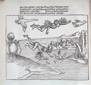 Although illustrations of flying men had long been common in manuscripts and other media, Albrecht Dürer's woodcut in Riedrer's Spiegel is the first such representation in a printed book. The story of the flight of Daedalus and his son Icarus was best known from a passage in Ovid: