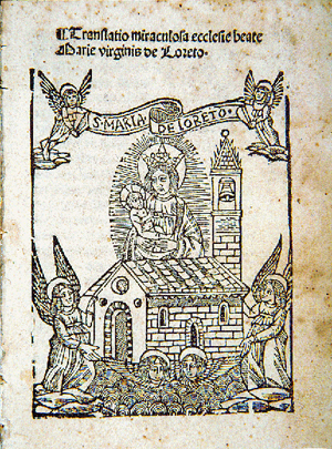 According to the legend, in 1291 angels transported the Virgin's house from Nazareth through the air and deposited it in Loreto to protect it from invading infidels. The story serves in part to counter pagan stories of mystical flight, such as an oracle that flies after being lifted by priests in Lucian's De Syria dea (sect. 37). Images of the flying house—including frescos, sketches, and paintings by Tiepolo (1692-1769)—are common.