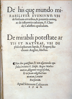 De his que mundo mirabiliter enenivnt: vbi de sensuum erroribus, & potentijs anime, ac de influentijs cælorum, F. Claudij Cælestini opusculum.  De mirabili potestate artis et natvrae, vbi de philosophorum lapide, F. Rogerij Bachonis Anglici, libellus.  Hæc duo gratissima, & non aspernanda opuscula, Orontius F. Delph.  Regius Mathematicus, diligenter recognoscebat, & in suam redigebat harmoniam.  Lutetiæ Parisiorum Apud Simonem Colinæum, 1542.