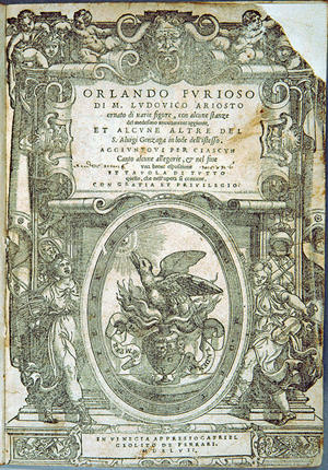 Other copies and editions in the Gimbel collection: PQ4567.A2 1572: Orlando Fvrioso . . . tvtto ricorretto. . . , illus. with woodcuts attrib. to Dosso Dossi (d. 1542), Venetia, 1572; PQ4582.E5 A35: Orlando Furioso, trans. from the Italian. . . with notes by John Hoole, 5 v., illus., London, 1799.