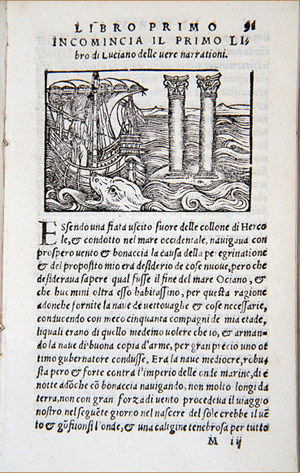 In classical literature voyages away from the surface of the earth, both to Hades and to Heaven, were relatively common, among the most celebrated and amusing being the dramatic visit to an aerial civilization in Aristophanes' play The Birds (414 B.C.E.).  Better known among readers of the Renaissance, however, were two journeys described by the Greek poet Lucian. The more familiar of these is his satire Icaromenippus, the hero of which travels to the heavens in search of truth. The other is a story in this "true history," which is in fact a parody of travelers' tales. Lucian tells us, tongue in cheek, that he made an involuntary journey to the moon when he was traveling beyond the Pillars of Hercules (the Straits of Gibraltar).