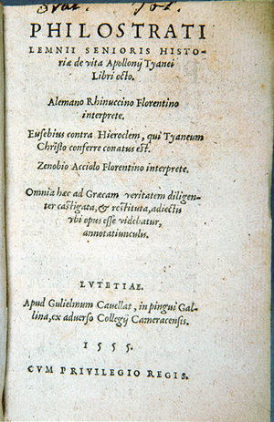 Philostrati Lemnii senioris historiæ de vita Apollonij Tyanei libri octo...Lvtetiae, Apud Gulielmum Cauellat, 1555.