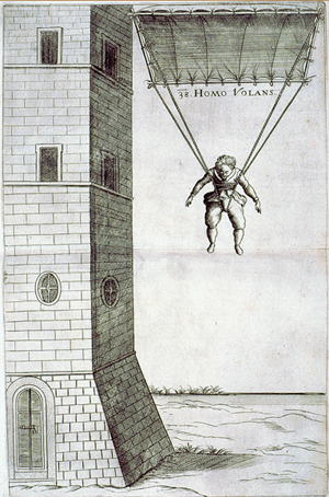 The earliest Western drawing of a parachute is probably that found in British Library Add. MS 34113, fol. 200v, dated about 1480 and very likely antedating Leonardo's famous design of about the same date. Whether Veranzio could have known of either of  these manuscript sketches is uncertain. In any event, the parachute reproduced here is the first to have appeared in a printed book. Like Leonardo's, it uses a rigid rectangular frame, though unlike Leonardo's pyramidal design the canopy is very flat—so flat as to be unstable. The illustration is in any case rather schematic: the uncomfortably harnessed parachutist, whose tunic is quite unruffled, is dropping very slowly. This design appears to have had little if any effect on later inventors. The first recorded free fall by a human being using a parachute was not made until André Jacques Garnerin descended from a balloon on October 22, 1797