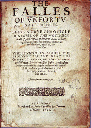 The | falles | of vnfortv- | nate Princes. | Being a trve chronicle | historie of the untimely |death of such Princes and men of Note, as haue | happened since the first entrance of Brvte | into this Iland, vntil this our latter Age. | Wherevnto is added the | famovs life and death of | Qveene Elizabeth, with a declaration of all | the Warres, Battels and Sea-fights, during her | Raigne: wherein at large is described the Battell | of 88. with the particular seruice of all | such Ships, and men of note in | that action. . .  At London, | Imprinted by Felix Kyngston for Thomas | Adams, 1620.
