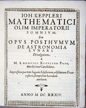 Ioh. Keppleri mathematici olim imperatorii Somnivm, seu opvs posthvmvm de astronomia lvnari. Divulgatum à M. Ludovico Kepplero filio, medicinæ candidato. Impressum partim Sagani Silesiorum, absolutum Francofurti, sumptibus hæredum authoris, 1634.