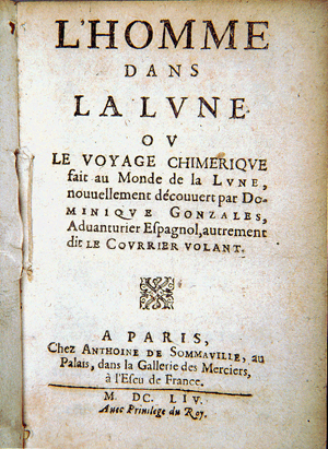 L'homme dans la lvne, ov Le voyage chimeriqve fait ou monde de la lvne, nouuellement découuert par Dominiqve Gonzales [pseud.], Aduanturier Espagnol, autrement dit le Covrrier volant.  A Paris, Chez Anthoine de Sommaville, 1654.