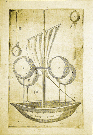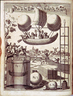 The Prodromo of the Jesuit priest Francesco Lana de Terzi is among the most frequently cited early books of aviation. Although his proposal for an airship began as little more than a scientific jeu d'esprit, it rapidly became very famous and was often taken seriously. It was frequently copied, embellished, and plagiarized. Lana surmised that large globes emptied of air would rise. He proposed that, on the basis of his calculations, the four globes, of thin copper or bronze (about 0.1 mm in thickness), should be twenty feet in diameter. He was aware of the experiments with the "Magdeburg spheres" (1654) that had so dramatically demonstrated the strength of air pressure (see Appendix, Guericke, Experimenta nova, 1672) and hoped—in vain, of course—that a purely spherical form would prevent the globes from collapsing. In a later treatise he suggested that the globes could be made of very light wood, such as is used for musical instruments. (Lana deTerzi, Magisterivm natvrae, et artis II, Brixiæ, 1686, pp. 293-294. See Appendix.) Such a structure should be strengthened with thin wooden laths bonded to it, and the whole might need to be varnished to keep it airtight. His calculations showed that globes so made need be only ten feet in diameter.