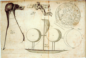 This book of natural "wonders"—an early encyclopedia—is one of many to copy Lana's design, with imaginative improvements. One of the crew steers the airborne ship by means of a rudder, which evidently needs little effort to manipulate. As in Lana's original, and in innumerable designs for steerable balloons and airships well on into the nineteenth century, the sail is falsely shown filled out by the wind and carrying the ship along. An awareness of the truth about relative speeds in the air was slow to develop. The earthbound onlookers, including the dogs, are astonished. The detail of the upward leaping dog is borrowed from representations of the shepherd-boy Ganymede, carried aloft by Jupiter, of which one of the best known is by Correggio (ca. 1530) in the Kunsthistorische Museum, Vienna. The skills of the modern scientist and engineer are shown to have surpassed the forces of pagan divinity.