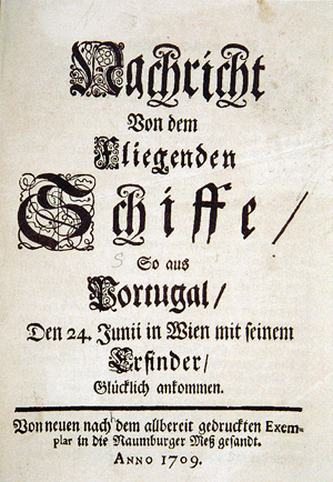 Nachricht von dem fliegenden Schiffe / so aus Portugal / den 24. Junii in Wien mit seinem Erfinder / glüklich ankommen...[n.p.,]1709.