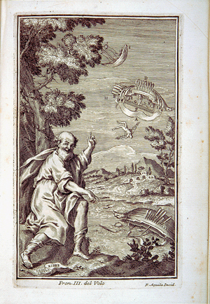 At the end of book IV of Degli occhi di Gesù  (first published Bologna, 1707) Martello describes an airship and its imaginary voyage.  When this edition of the poem was published, he added the four prose dialogues entitled "Del volo"; in later editions the fourth dialogue ("Mattina ultima") was suppressed.  Cf. Boffito, G., Biblioteca aeronautica italiana, 1929, p. 276; Venturini, G., Da Icaro a Montgolfier, 1928, I.272-298.