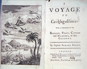 A voyage to Cacklogallinia: with a description of the religion, policy, customs and manners, of that country.  By Captain Samuel Brunt. London, J. Watson, 1727.