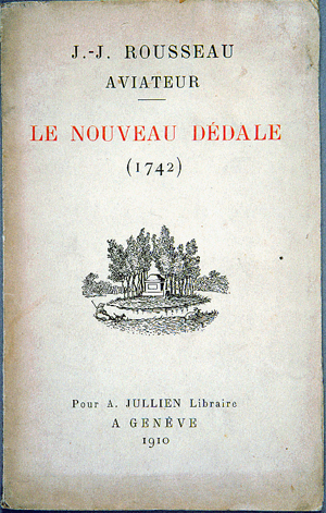 In 1742 a highly eccentric Frenchman called Jean-François Boyvin de Bonnetot, who falsely styled himself Marquis de Bacqueville, announced hat he would fly across the Seine from his house on the quai des Théatins (now the quai Voltaire) and land in the Tuileries. At that date he was about 60 years old. A crowd gathered to watch as Bacqueville, with wings attached to his arms and legs, threw himself from a window. Exaggerated accounts say that he flew for "100 fathoms" (600 feet) before falling into a laundry boat where, as is so often related in accounts of such attempts, he broke his thigh. He nevertheless survived his ordeal and did not die until 1760—and then only in a fire that burned down his house. Rousseau, who had been among the crowd of onlookers at the attempt to cross the Seine, was prompted by the event to write a speculative essay on the possibility of human flight, which he found an intriguing puzzle. (He plays on the meaning of dédale as a common noun: maze, or labyrinth.) Taking up the idea of aerial navigation, he points out that a flying machine will not sail on the surface of the air, as does a ship on water, but will be immersed in it. He focuses also on the difficulty of maintaining control over the altitude of any machine dependent on lighter-than-air principles.