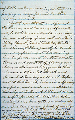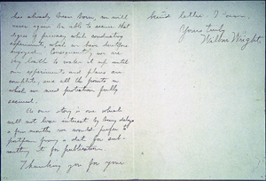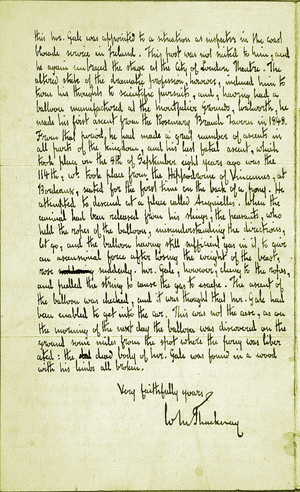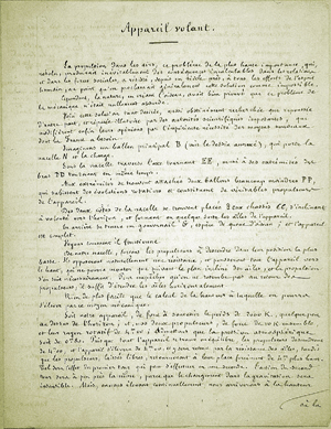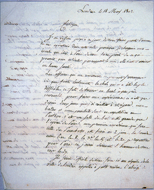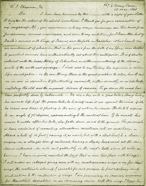 As with the printed books, the strength of the Gimbel collection's 324 manuscripts and typescripts lies in their diversity. Together with letters from many of the most significant figures in the history of aeronautics since the late eighteenth century—the Montgolfiers, Pilâtre de Rozier, Gaston Tissandier, Otto Lilienthal, Octave Chanute, Count von Zeppelin, Alberto Santos-Dumont—it includes material helping to reveal the scientific, social, and personal contexts in which aeronautical experiments were carried out. Letters from the loquacious Faujas de Saint-Fond, who did so much to publicize the early balloon flights, tell us much about his personality. In addition to notes and letters from Wilbur and Orville Wright, several personal letters from their father, Milton, provide insights into the familial atmosphere in which the brothers lived and worked. Letters from Samuel Pierpont Langley reveal details of his dealings with others. Although most of the manuscripts are private communications, there is a complete, two-volume anonymous novel including a passage on a balloon flight, an Italian manuscript that relates what seems to be an imaginary account of the construction and inflation of balloons, and several manuscript drafts of material that was subsequently printed and published.