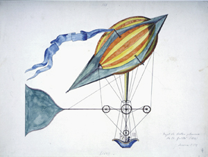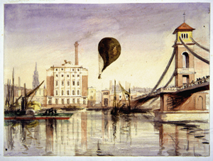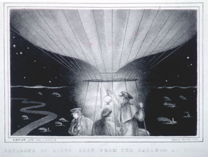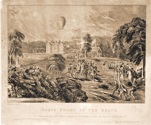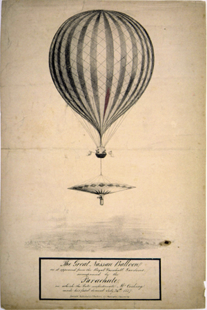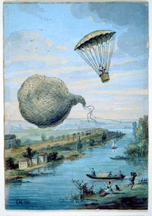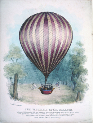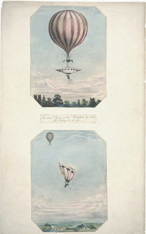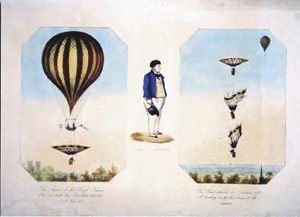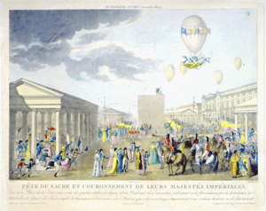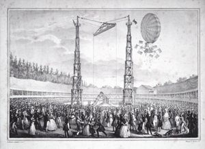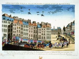 This view of the Champs Elysées shows the scene of the festivities, and the caption relates that a "temple has been constructed in the square of the Champs Elysées, in which the concert was held." The balloon in the background is shown dropping a parachute; it probably is that of André Jacques Garnerin. In the upper left a small, unmanned balloon can be seen. (The Gimbel collection includes numerous examples of this genre, including: XP-XL-9 1318: "The Chinese Pagoda and bridge . . . for the Grand Jubilee of the 1st of August"; XP-XL-9 1319: "Coronation procession of his Majesty George the Fourth 19 July 1821"; XP-XL-9 1321: "London Bridge opened by King William IV and Queen Adelaide, August 1, 1831"; XP-XL-9 1330: "Révolution Française 1848, fête de la Concorde"; XP-XL-11 1369: "Vue perspective du Champ de Mars le jour de la fête donée le 24 Juin 1810"; XP-XL-11 1386: "Entrée triomphante de S.M. Louis xviii dans sa capitale.")