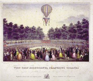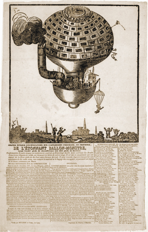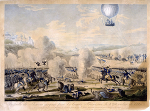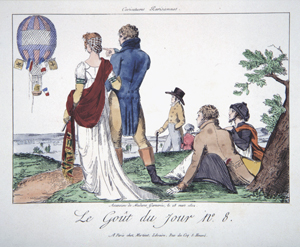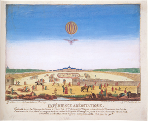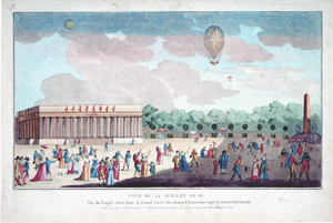 Numerous prints celebrate the commemorative use of the balloon in official functions, especially in the Napoleonic era. This print represents a celebration on July 14, 1801, which commemorated the formation of the French republic, a day then referred to as the "Anniversary of the Federation" by the French and now referred to as Bastille Day by English-speakers. It memorialized the taking of the small state prison and fortress, the Bastille, on July 14, 1789, by Parisian citizens after a four-hour battle; to the revolutionaries, the prison represented the arbitrary power of the king, who could imprison without trial. In 1801 the Anniversary of the Federation began at six in the morning with thirty rounds of cannon fire and included displays of statuary, pantomime exhibitions, skits, balls, orchestras, and the balloon ascension depicted here. In the evening, the theatres were opened to the public without charge, and fireworks decorated the sky.