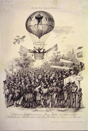 Shown in the basket are Christian Lehmann, his daughter Caroline, and the Viennese scientist Dr. Johann F. Natterer. Caroline is throwing handbills from the basket, while the two men are involved in the customary waving of hats and flags. The wings on either side of the basket are presumably meant for propulsion.