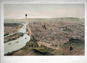 Jules Arnout, a student of Jean Sebastian Rouillard (1759-1850), was known for his landscapes of Italy, France, and Great Britain. The symbol "1" at bottom center may indicate that this is first in a series. (Print XP-XL-10 1341 is same with black and brown only. Compare, from the same series, XP-XL-10 1342; "Brighton. View taken in balloon. Brighton. Vue pris en ballon." The Gimbel collection includes nine of Arnout's aerial views of English and French cities, numbered XP-XL-10 1341-1349, about half dated 1846 and half undated. Included are views of Paris, Versailles, Blois, St. Cloud, Windsor, and Brighton.  Print XP-XL-20 1843 is a view of Alameda, Mexico.)