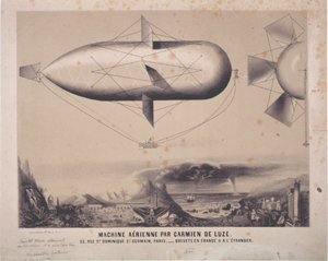 Carmien de Luze designed this airship, in which the envelope rotates on its longitudinal axis and propulsion is provided from the vanes striking the air.  According to John Grand-Carteret, the design was patented in 1862, and the airship itself was to appear in 1864. The design evokes both an earlier and later manifestation of the rotating envelope scheme: Pierre Ferrand's plan using a helical arrangement of planes around the envelope in 1835; and the Cyclocrane introduced in Oregon in 1984, which rotated its envelope in order to provide lift from airfoils fixed longitudinally around its periphery. Below the ship is a bizarre scenario of disaster and ruin, including a battle, a safari with elephants, a shipwreck, a ship struck by lightning, and a waterspout.
