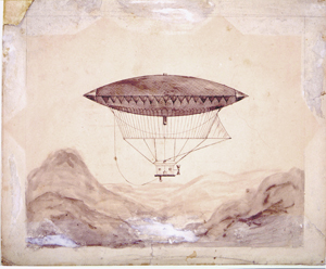 A 3-horsepower steam engine powered this dirigible designed and flown from Paris by the renowned engineer Henri Giffard on September 24, 1852. Emile Cassé witnessed the flight and was struck by "the strange feeling we felt as we saw the brave inventor rise up in his machine to the whistling noise of the steam, replacing in these circumstances the usual waving of a flag." The aircraft was able to develop a speed of about 5 miles per hour. "Not for a single moment did I dream of struggling against the wind; the power of the engine would not have permitted it," Giffard reported. "That had been thought of in advance and proved by calculations; but I carried out various manoeuvres of circular and lateral movement successfully." Giffard built a second machine that was launched in 1855; it was similar to this one, but 230 feet long as opposed to 144. It failed during the initial flight. (This drawing shows a car with solid walls rather than the open nacelle of the actual machine.)