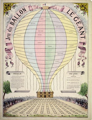 This board game is inspired by the huge balloon Le Géant, built by the famous photographer and aeronautical enthusiast Nadar (or Félix Tournachon). Le Géant held 212,000 cubic feet of gas and produced a lift of more than four tons; below this massive envelope was a two-story wicker car with a balcony, passenger compartments, a photographic lab, and a printing press. The balloon made two flights in 1863 from the Champ de Mars, on October 4 and 18. The first flight, with Nadar in command and two of the Godard brothers as assistants, carried twelve additional passengers. It ended only fifteen miles from Paris, probably because of a badly seated gas valve at the crown. The second flight was an overnight voyage of 400 miles, with Nadar and the Godards accompanied by six passengers; it ended with a spectacular crash landing in Germany. This flight was sensationalized by the press, and this board game was probably inspired by it. The game is played with dice, and the players advance from the twelve spaces at bottom (the "Champ de Mars") up the tether lines and net to the crown of the balloon. Players suffer penalties if they land on "accident" or "broken rope."  Landing on "valve" requires descent to the bottom of the basket, or car. Nadar flew Le Géant from various European cities until 1867.