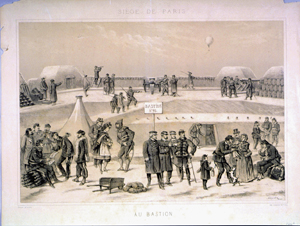 Sixty-six manned (and one unmanned) balloons, departed from Paris during the siege of 1870-1871, bringing out large quantities of mail and dispatches and, occasionally, political leaders needed for the war effort outside the besieged capital. This scene from the Franco-Prussion War appears to be apocryphal—the bastion shown, "No. 95," never existed.  Renard, whose pseudonym consisted of his name spelled backward, also published a series of colored views on the siege in book form, including Souvenirs du siège de Paris: les soldats de la République; Souvenirs du siège de Paris: les défenseurs de la Capitale; and Paris assiégé.