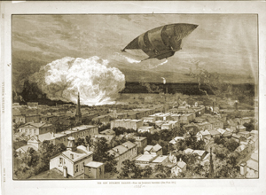 This print appeared in Harpers Weekly of May 23, 1885. A short accompanying article discusses the proposal of Russell Thayer, who designed the 185-foot-long "dynamite balloon" and suggested its use to the U.S. Navy. The airship was to drop "huge bombs" of dynamite, a material invented almost twenty years earlier but only recently embraced by the military. Although the article concedes that a satisfactory method for propelling airships was not at hand, it noted that "new methods hold out new possibilities." Predicting that recently developed engines would provide a solution, the article compares the advent of the airship to that of the marine screw propeller, concluding that the airships' "value in peace might overshadow their war uses." In France, in 1883 and 1884, Albert and Gaston Tissandier and Charles Renard and Arthur Krebs had launced electrically propelled airships that were only moderately successful. In the print, the artist dramatically shows discharged smoke, suggesting the use of steam. Two men are shown standing in the car, from which a bomb has just been dropped.