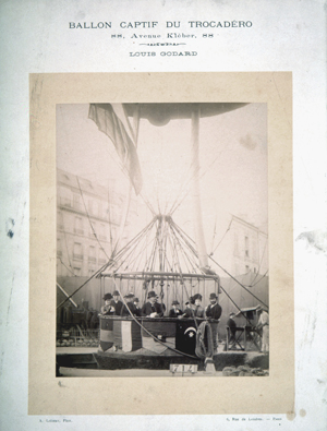 Dated 1889, this photograph shows the large captive balloon managed by Louis Godard, nephew of the famous Eugène Godard, a pioneer in the genre of the large balloon. Both were balloon builders, and the family included numerous balloonists, led by Eugène; Pierre, father of Eugène, and Eugène's brothers and sisters—Louis (son of Louis who managed the pictured balloon); August, Jules, and Eugénie. In fact the Godard name became so closely associated with the balloon that in 1960 historian Charles Dollfus claimed he could still find people in the French countryside who referred to any spherical balloon as a "godard." This view was no doubt taken during the Paris Exposition of 1889, which was visited by 32 million people, and during which the Eiffel Tower opened. Liébert, known for applying electric lighting to indoor photography, ran a concession at the Exposition to photograph balloon passengers. In the photograph, ten people fill the basket, which is draped by flags, including, curiously, that of Turkey, which was officially absent from the Exposition. Seen on the right, attached to the basket, is a heavy dragline and anchor, so the balloon is prepared for free flight should it sever its tether. In the background at lower left a wheeled hydrogen generator can be seen. This photograph evokes the famous grands ballons captifs of Henri Giffard, the last of which rose above Paris for the Exposition of 1878 and could carry fifty people; Giffard built his first great tethered balloon for the Exposition of 1867.