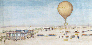 This scroll’s numerous written captions simply name the technical apparatus and other features, but it likely illustrates the activities of the summer of 1887, when the French introduced the first balloon into China. Two balloons were brought from France to the Tientsin military academy near Peking, including one of 3,000 cubic meters that could carry ten people. Though the balloons arrived in early April, the aeronaut Pillas-Panis worked until September instructing the academy’s students and staff in balloon history, technique and maneuvers. On October 2, 1887, Pillas-Panis ascended before a crowd he estimated to contain 200,000 people. By the end of November Pillas-Panis was able to entrust the operation to his students; the improvements to the grounds, including the corrugated metal balloon shed, suggest that the balloons were intended as permanent additions to the Chinese army.
