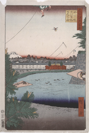 In this woodcut, part of a series of 100 views around Tokyo produced between 1853 and 1856, Hiroshige, one of the most prominent of Japanese printmakers, shows a number of kites being flown. Presumably the scene is a breezy New Year's Day, since the game hagoita, with its shuttle in the center and paddles shown in the foreground, is generally played then. Kites, which came to the West from the Orient centuries ago, have their origins in ancient times, apparently around 200 B.C.E. They played an important role in the development of the airplane because experimenters extensively used kites to perfect wing structures.