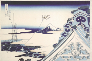 This view is part of a famous series of 46 prints of Fugaku (Mount Fuji) produced by Hokusai between 1825 and 1831, although 36 prints are cited in the title.  Above a bustling scenario, with workmen repairing the Hongan Temple in the foreground, the kite at center commands the scene, including the clouds that partially obscure the dwellings. This print might be compared to early French balloon prints and especially to Tavenard's "Vue de la Terrasse de Mr. Franklin à Passi," which includes the motif of an observer atop a roof. Hokusai was one of the most prominent of printmakers; his "Wave" (also a part of "Thirty-six Views"), which shows a distant Mount Fuji framed by large seas, is familiar to many Westerners.