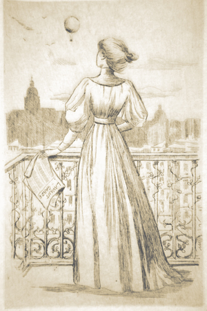 This fin de siècle image is without extraneous words; L'Avant Garde, which serves as the title to the newspaper, also suggests the meaning of the print. The clothing, iron railing, the swept-back hair, and the balloon all contribute to the modernism of the scene, elaborated by the artist's stylistic liberty.