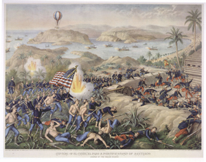 Under the command of the 300-pound Civil War hero, General William R. Shafter, American troops landed in Cuba on June 20, 1898, to continue the Spanish-American War; the conflict lasted about ten weeks and established Theodore Roosevelt as a national hero. In the battle of El Caney, near Santiago, Lieutenant Colonel Roosevelt ordered his Rough Riders to attack fortifications on the hills above the battleground. During the battle, balloonist Ivy Baldwin ascended several times to observe the action in an antiquated balloon that the U.S. Army had purchased in France in 1892. The intelligence gained from the flights was of great value, but the balloon attracted a great deal of enemy fire onto the surrounding area, and many derided the role of the balloon, pointing out that it allowed enemy gunners to locate the army's position. General Shafter, incidentally, had been awarded the Medal of Honor in 1867 for his heroism in the Battle of Fair Oaks, which is represented in print XP-XL-25 2034.