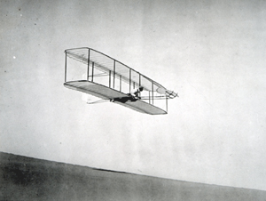 This photograph shows one of the Wright brothers in flight during their Kitty Hawk trials of October 1902, after the twin-surface, fixed rudder had been replaced by a single-surface, adjustable one. The new rudder was designed to add much-needed stability, but the Wrights feared it was also going to add to the complexity of flying the aircraft. In Orville Wright's words, the pilot "would now not only have to think, and think quickly, in operating the front elevator . . . he would also have to think so as to operate this rudder." To simplify the pilot's task, the control of the rudder was made automatic and linked to the control for warping the wings and rolling the aircraft; it was later made independent. "With the machine as now constituted," wrote Orville, "we began a long series of gliding flights. The disastrous experiences which we had when the fixed vanes [i.e., the rudders] were used now seemed entirely avoidable." The Wright brothers made just over 300 photographs of their aeronautical work, partly to further and partly to document their own research. Their negatives were bequeathed to the Library of Congress in 1949.