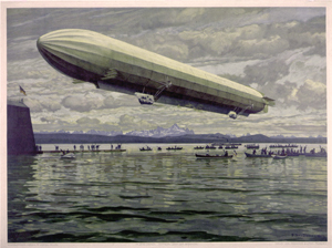 This poster was created in 1909, a significant year for Count Ferdinand von Zeppelin and his dirigibles. An airship (LZ5) was completed in the spring, funded largely by contributions from the German people, and on May 29 Count Zeppelin undertook an ambitious flight from his base at Friedrichshafen almost to Berlin. The airship was damaged when it struck a tree at Goppingen while returning to Friedrichshafen, but completed the flight of 850 miles in 36 hours.  Another ship (LZ6) was completed in August, and after a flight to Berlin, gave a series of sightseeing tours over the Bodensee, or Lake Constance, situated between Switzerland and Germany.  Zeppelin's airships achieved notoriety in 1909, the same year that one was first accepted for military service by the German army.  In November, Count Zeppelin founded the famous Deutsche Luftschiffahrts-Aktien-Gesselschaft (or "Delag"), which historians have called the "first commercial airline."