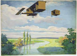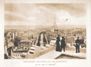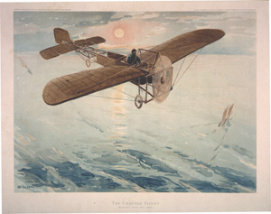 The first overflight of a major city by airplane is attributed to the Count de Lambert (Wilbur Wright's first pupil), who excited the Parisian populace on October 18, 1909, by circling the Eiffel Tower in a Wright airplane. But when Emile Dubonnet "aeroplaned" across the city on the afternoon of April 24, 1910, there was an even greater sensation. In a flight of about 42 miles Dubonnet crossed over the Place de la Concorde and flew down the Champs Elysées, all at an altitude of 200 feet, occasionally rising to 300. At such a height he was affected by eddies from the buildings, which he sometimes found "difficult to negotiate." Dubonnet was a pilot for Tellier Works, makers of speedboats and constructors of the monoplane shown in this print. (Lambert's flight is commemorated in print XP-XL-19 1801, "de Lambert im Wrightflieger über Paris.")