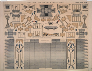 "Le Zeppelin" is one of a series of paper cut-out models collected by Gimbel.  When assembled, the model would be about 13 inches long; at center can be seen a small vignette showing the airship in flight. The model probably dates from about 1910, as it emulates the Zeppelins made between 1905 and 1910. In 1910 five Zeppelins began to be used for a tourist service in Germany that carried over 35,000 passengers until the beginning of the World War in 1914.