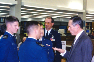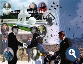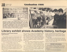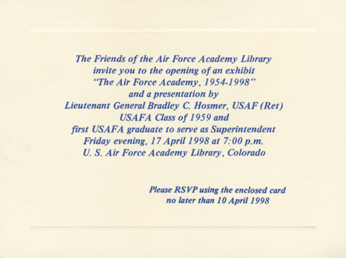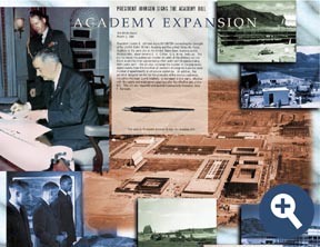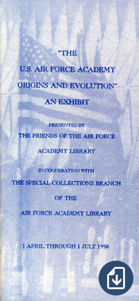 The exhibit is drawn from the rich collection of official documents, personal papers, photographs, news clippings, and Academy related publications which are housed within the Special Collections Branch of the Air Force Academy Library. The Special Collections Branch operates as the Academy’s institutional archives. It serves as the repository for historical documents which reflect the origin, establishment, development, and operation of the Air Force Academy.