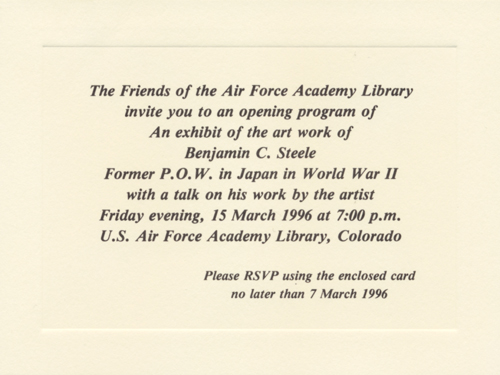 The Ben Steele Art Collection is now part of the Northcutt Gallery of Art at Eastern Montana College. The 80 drawings fall into three categories. The first includes the original drawings done in the prison camps. Most of these were done in Bilibid Prison in the Philippines and were lost at sea. The remaining original drawings were completed in 1945 in Japan. The second category includes drawings done after the war while Steele was in various hospitals. Later, after formal art training, he completed the remaining drawings and the three paintings.